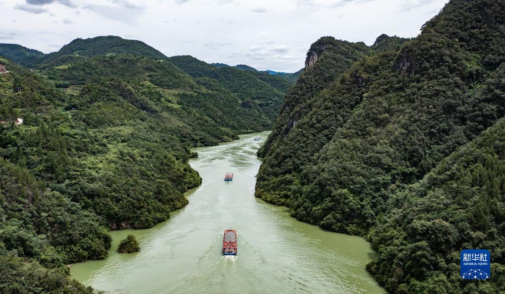 集装箱货轮从贵州省遵义市余庆县沙湾码头驶出,前往重庆涪陵黄旗港(7月14日摄,无人机照片)。