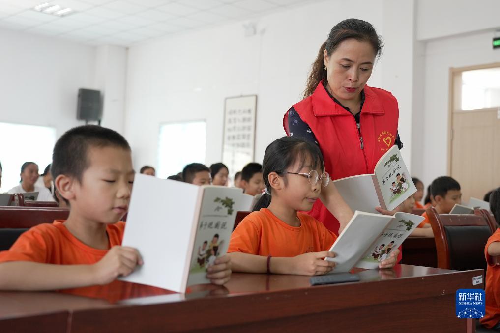 7月17日,在河北省沧州市孟村回族自治县新时代文明实践中心,志愿者教孩子们诵读国学经典。