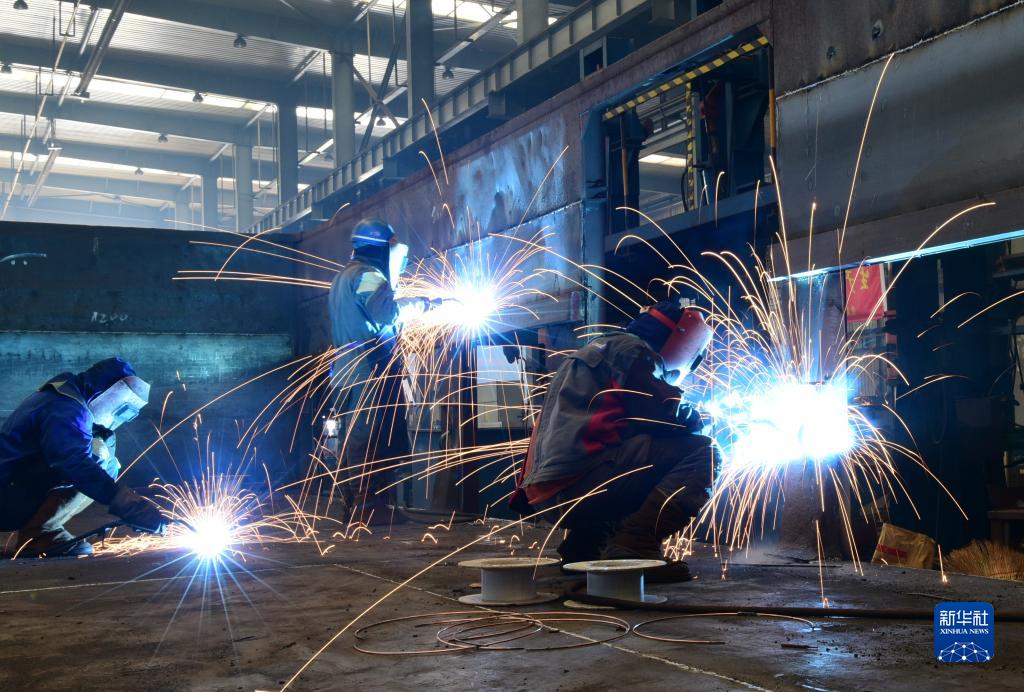 7月17日,在中车齐车集团石家庄公司钢结构车间,工人在焊接车体地板及侧墙。