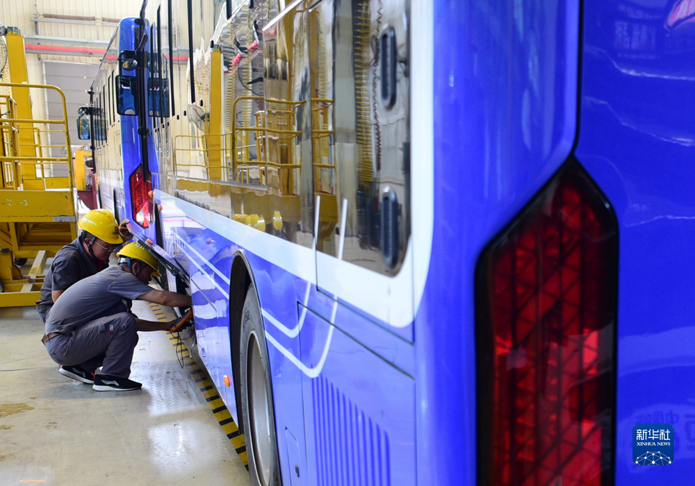 7月17日,在中车齐车集团石家庄公司生产车间,工人在检测新能源汽车线路。