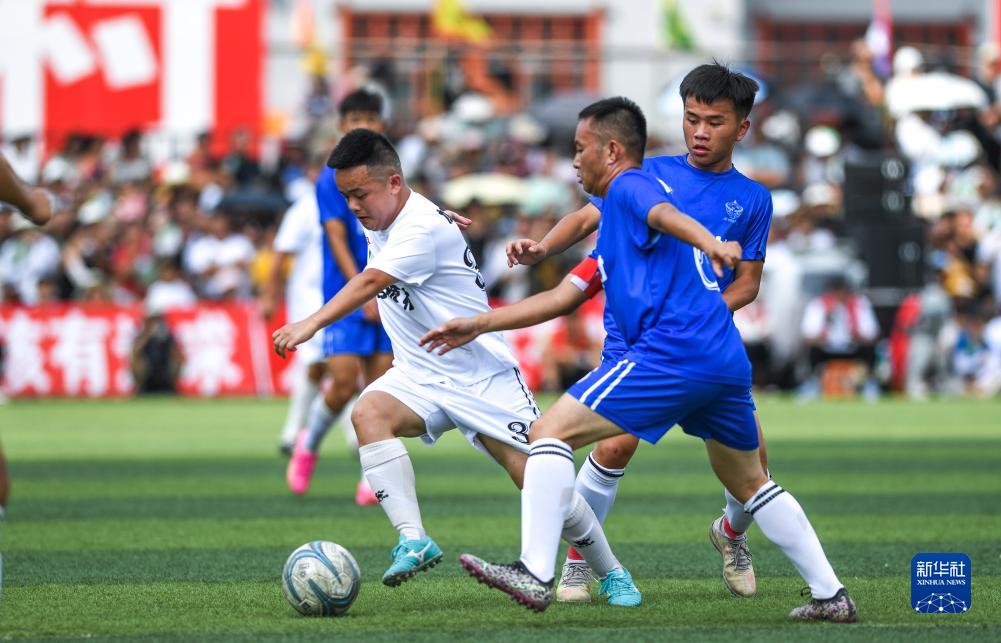 7月15日,六佰塘村足球队球员杨宗维(左一)在与月寨村足球队的比赛中拼抢。
