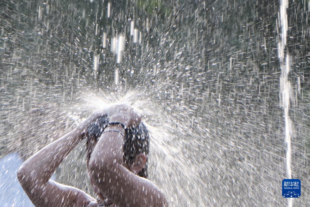 7月17日,一名女子在西班牙马德里的喷泉中解暑。