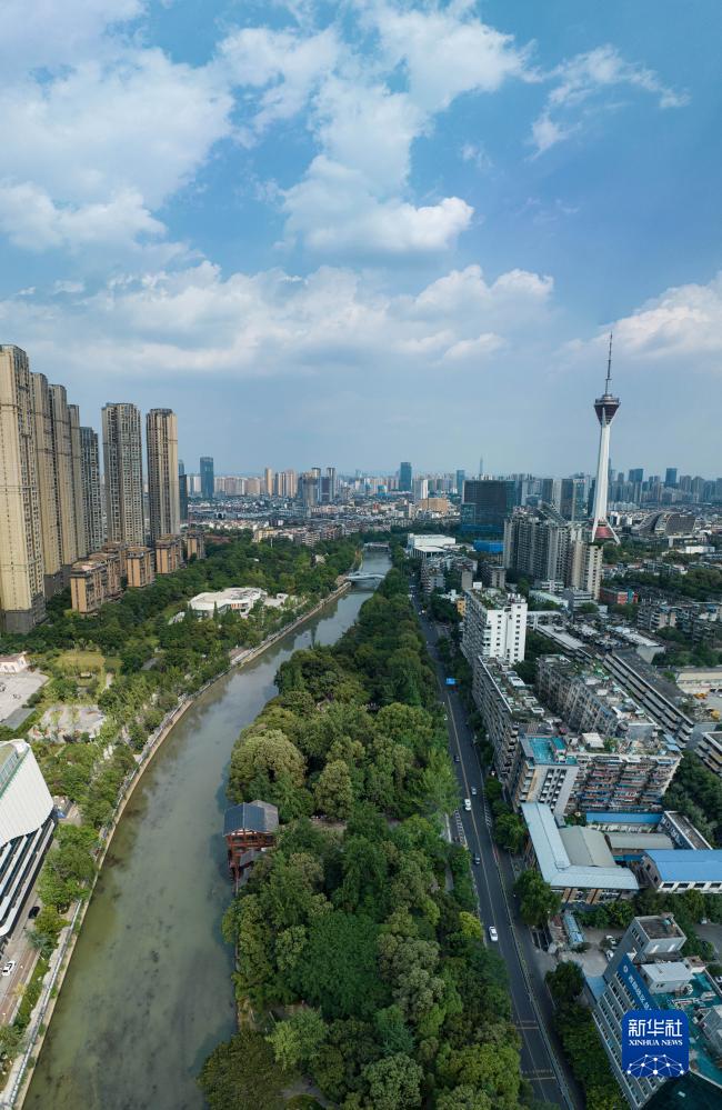 这是位于成都市府河边的活水公园(无人机照片,6月23日摄)。