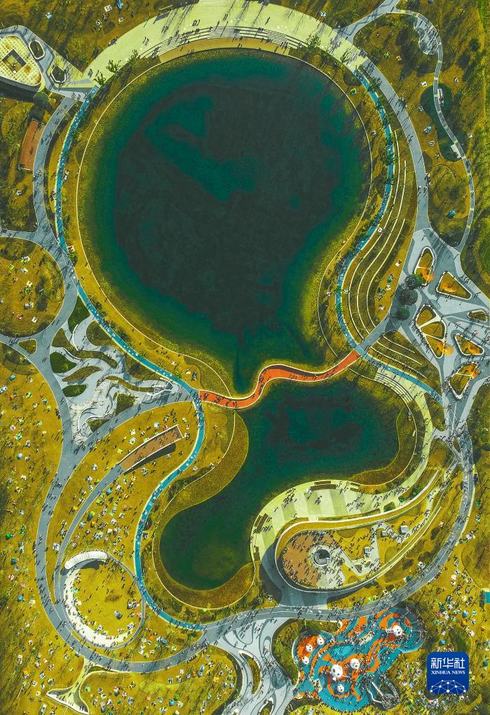 这是成都市龙潭新区公园的湖水和环湖绿道(无人机照片,2021年1月17日摄)。