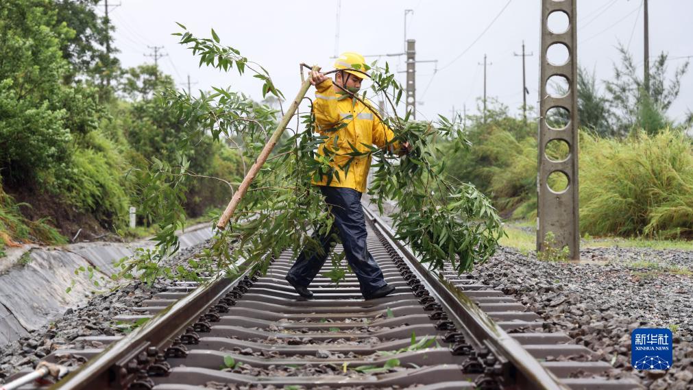 7月18日,国铁南宁局沿海铁路公司职工在清理轨道上的树枝。当日,国铁南宁局沿海铁路公司组织职工利用轨道车,在风雨中对西部陆海新通道铁路沿线进行巡检,对线路和防洪重点处所进行全面巡查,及时处理危竹危树、接触网设备隐患等问题,全力确保铁路运行安全。