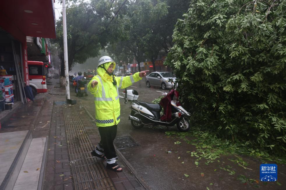 7月18日,在广西钦州市文峰路,一名交警在被“泰利”台风吹倒的树边指挥交通。