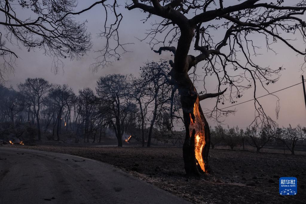 这是7月17日在希腊雅典郊外卢特拉基附近拍摄的燃烧着的树木。