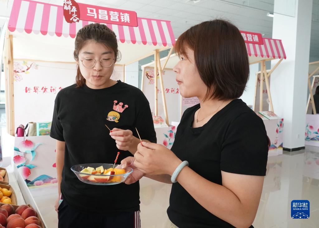 7月18日,观众在2023北京·平谷鲜桃季“土特产”市集现场品尝桃子。