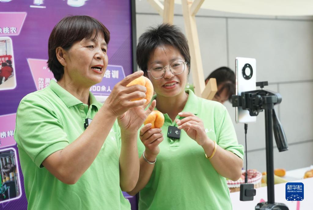 7月18日,在2023北京·平谷鲜桃季“土特产”市集现场,工作人员通过直播的方式进行桃子销售。