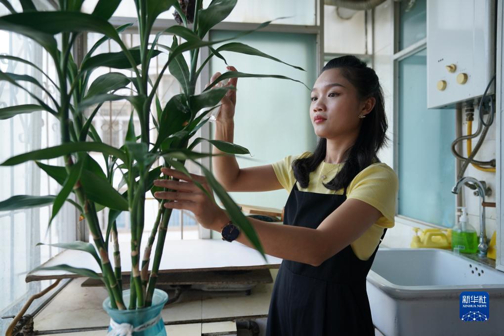 依波逢在位于昆明的住处打理绿植(7月15日摄)。