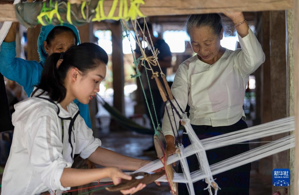 7月16日,依波逢的外婆(右)指导依波逢织布。