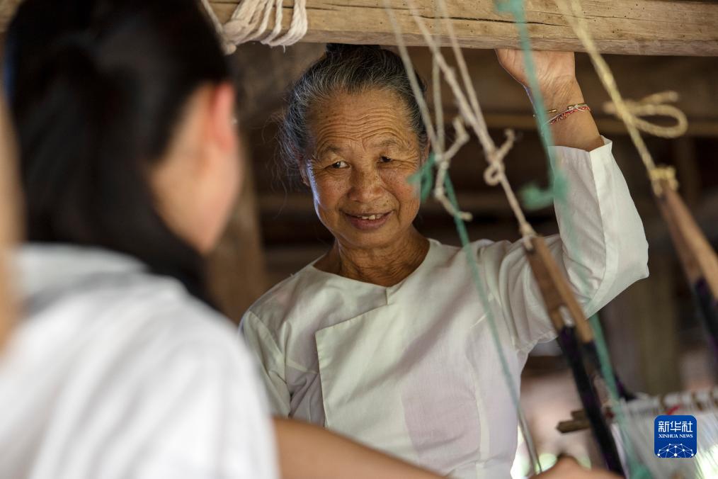 7月16日,依波逢的外婆(右)指导依波逢织布。