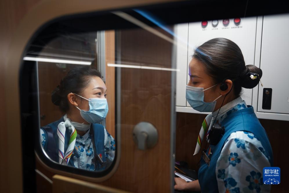 依波逢(左)在D887次列车上与同事交流工作(7月16日摄)。
