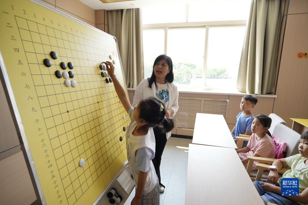 7月19日,孩子们在河北省唐山市丰南区新兴社区开办的“爱心暑托班”上学习围棋。