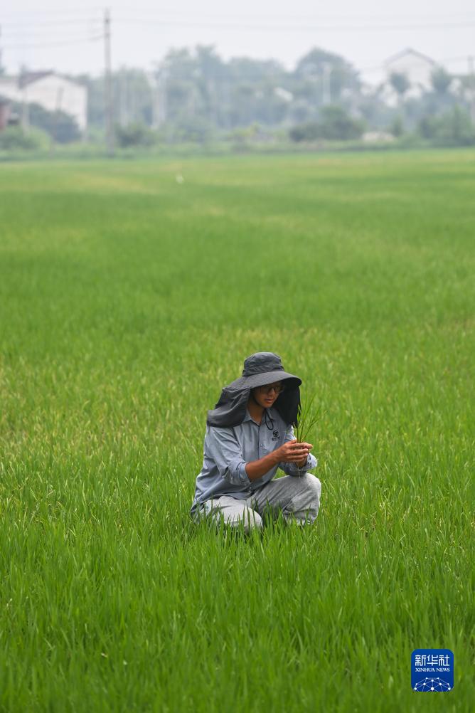 7月19日,在湖州市东林镇保永村,种粮大户查看水稻的长势。