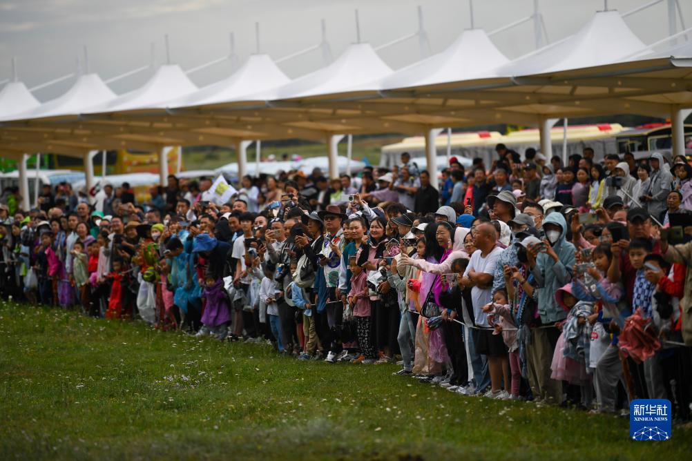 游客在新疆伊犁哈萨克自治州昭苏县湿地公园景区观看牧民表演(7月17日摄)。