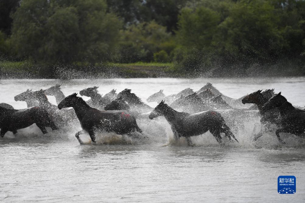 这是7月17日在新疆伊犁哈萨克自治州昭苏县湿地公园景区拍摄的“天马浴河”景观(无人机照片)。