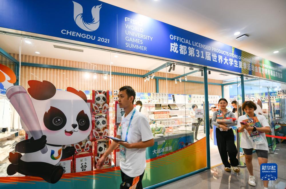 7月13日,在成都大运会主媒体中心大运会官方特许商品零售店,媒体记者和工作人员选购商品后离开。