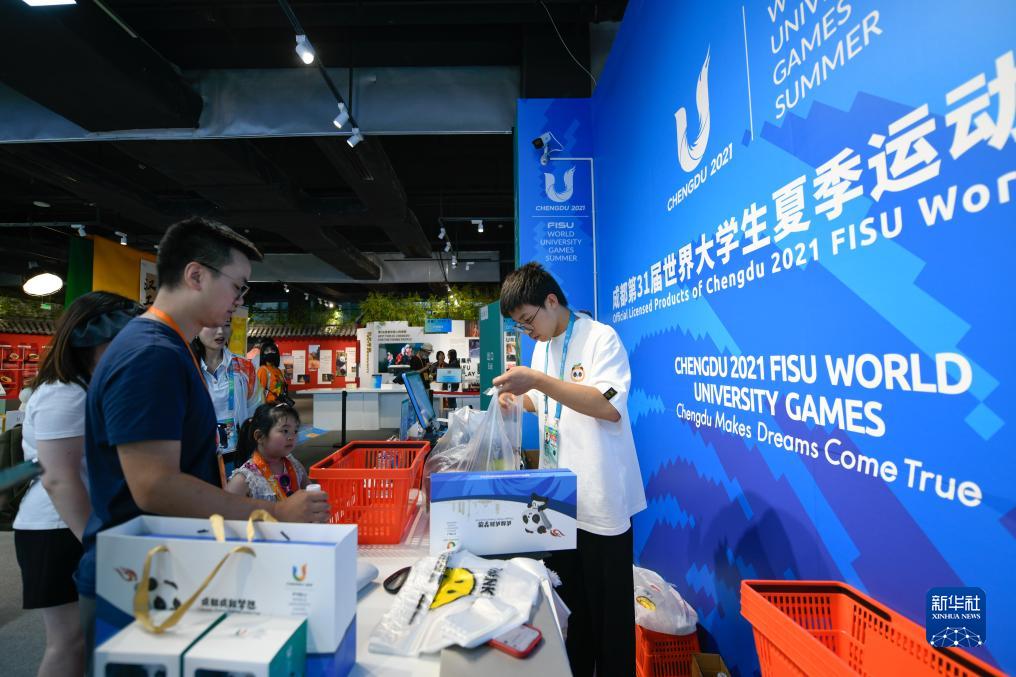 7月16日,市民在成都大运会大运村官方特许商品零售店内选购特许商品。