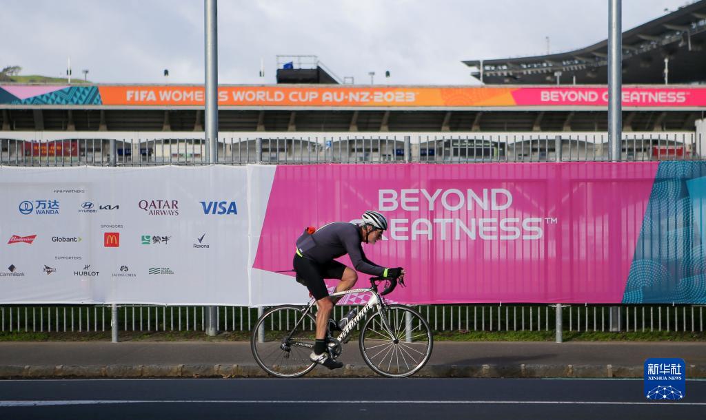 7月17日,在新西兰奥克兰,一名骑行者骑车经过伊甸公园球场。