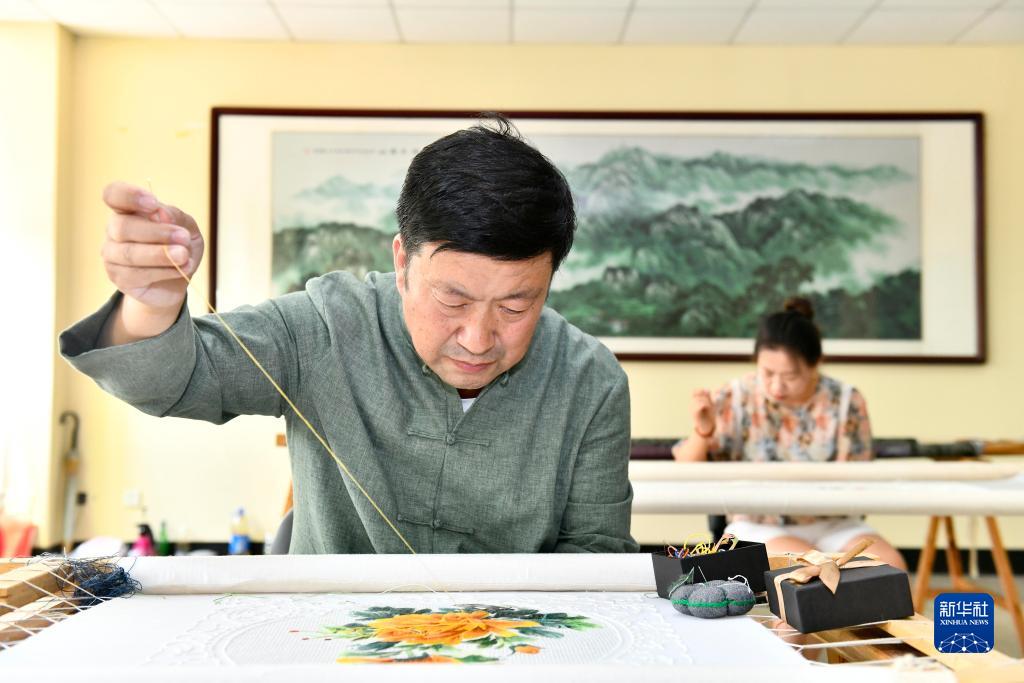 7月19日,在威海市文登区鲁绣非遗工坊,非遗传承人田世科在绣制鲁绣作品。