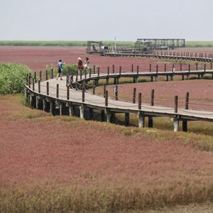 近日,辽宁盘锦红海滩国家风景廊道内的碱蓬草迎来最佳观赏期,红滩绿苇,景色优美,吸引游客前来观赏游玩。