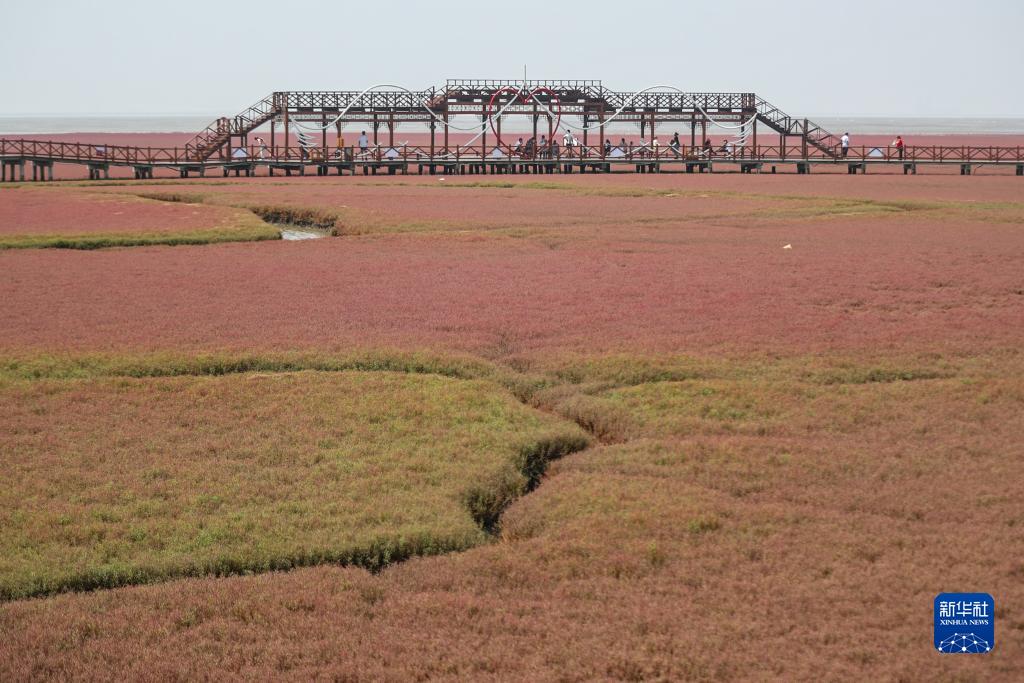 7月19日,游客在红海滩国家风景廊道景区内游玩。