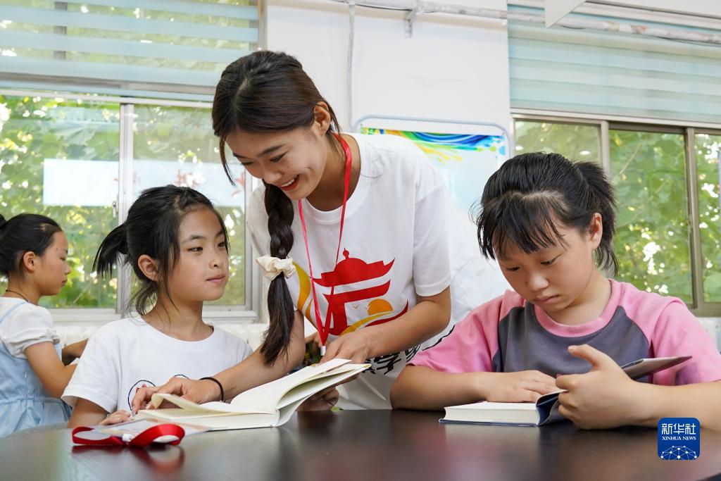 7月18日,在无棣县棣丰街道星湖社区服务中心,返乡大学生志愿者辅导孩子阅读。