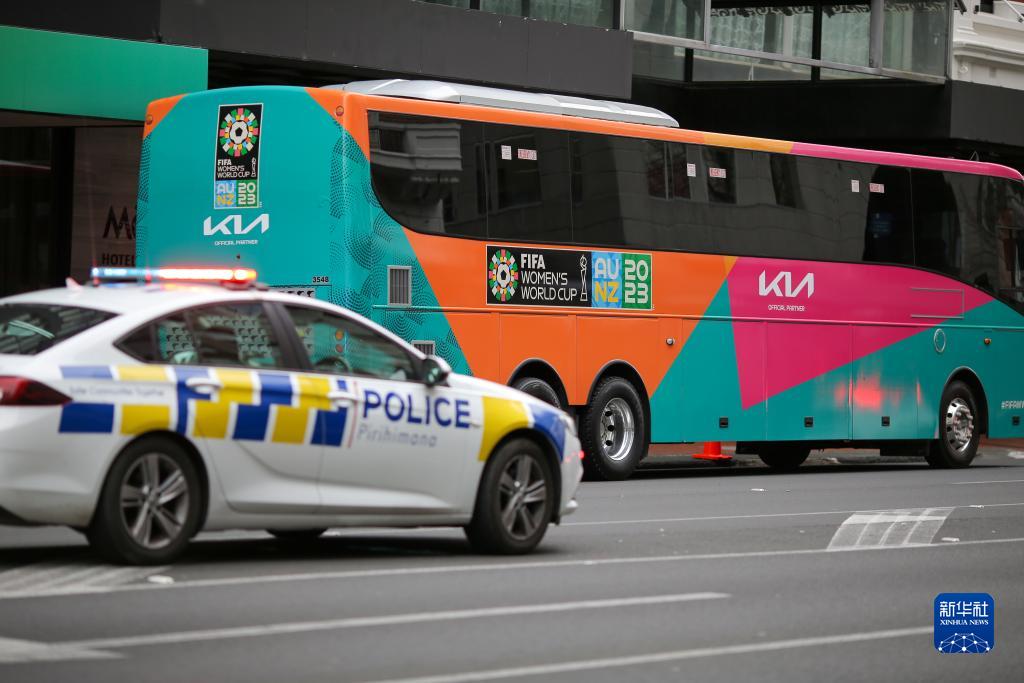 7月20日,在新西兰奥克兰,警车经过一辆女足世界杯专用巴士。