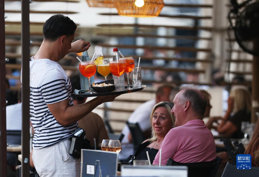 7月18日,在法国南部城市蒙彼利埃一家餐馆,服务员为顾客上冰饮。