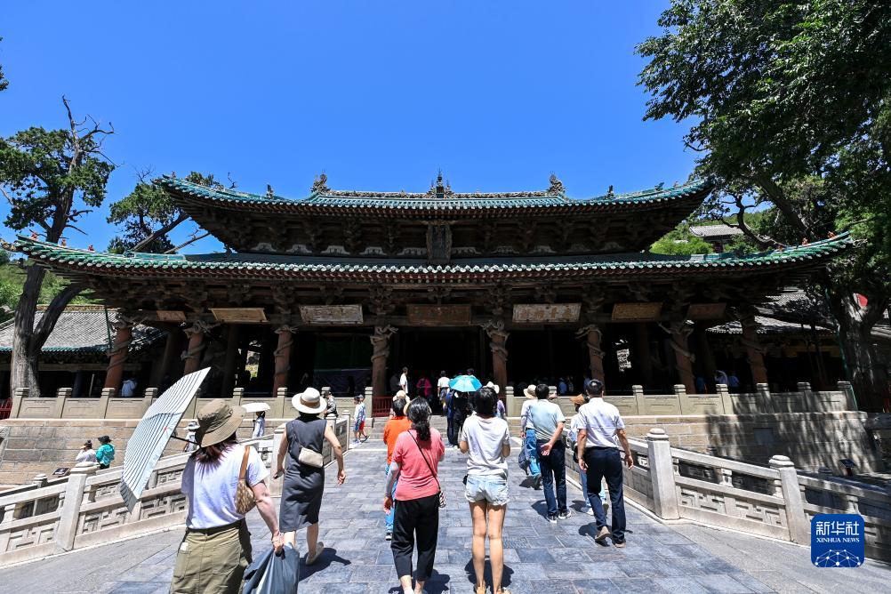 游客参观晋祠圣母殿和殿前的十字形古桥鱼沼飞梁(7月4日摄)。