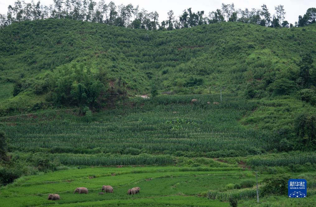 7月19日,一群亚洲象在稻田和玉米地中“大快朵颐”。
