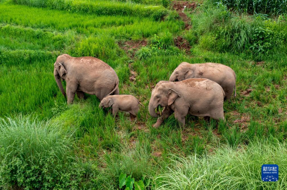 7月19日,四头野生亚洲象在普洱市江城县一处稻田里觅食(无人机照片)。