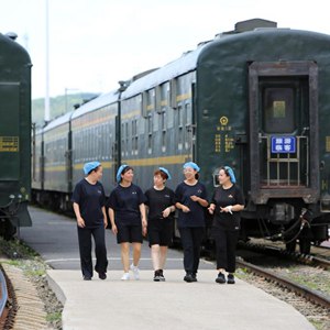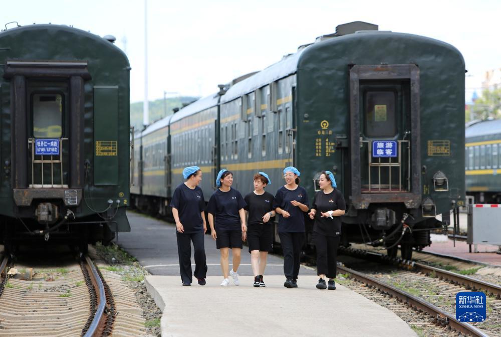 在牡丹江客运段,洗涤二班部分班组成员走在下班路上(7月19日摄)。