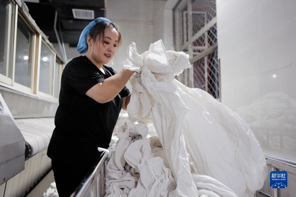 在牡丹江客运段牡(牡丹江)整备车间,洗涤二班班组长李滨整理清洗后的列车卧具备品(7月19日摄)。