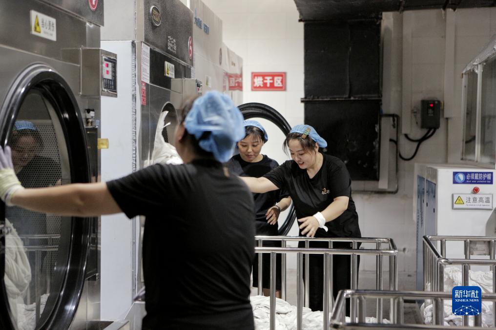 在牡丹江客运段牡(牡丹江)整备车间,洗涤二班班组成员把清洗后的列车卧具备品送进烘干机(7月19日摄)。