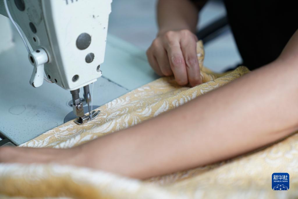 在牡丹江客运段牡(牡丹江)整备车间,洗涤二班的一名班组成员用缝纫机缝制加固列车卧具备品(7月19日摄)。