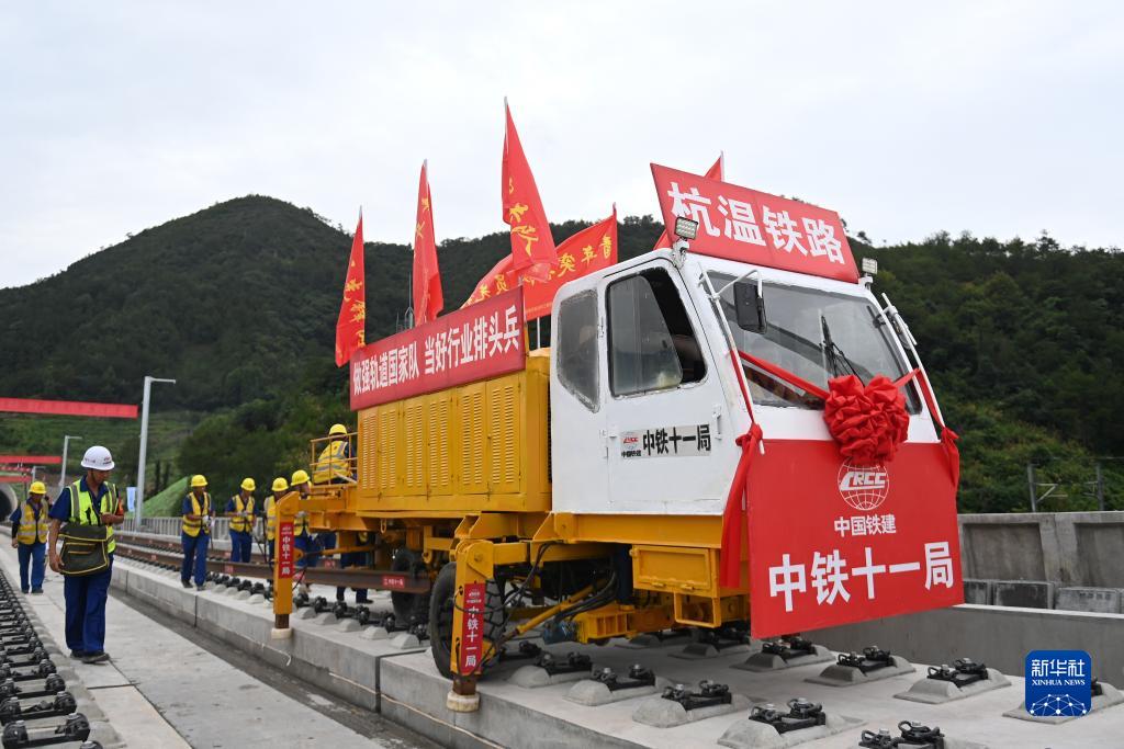 7月20日,中铁十一局施工人员在杭温铁路上进行铺轨作业。