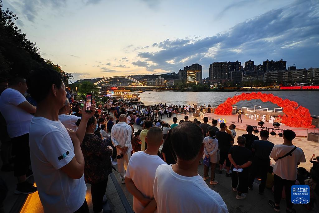 夏夜,在黄河兰州段,河两岸的建筑群、桥梁被霓虹灯光点亮。市民和游客漫步在黄河岸边,看演出、赏美景、乘游船,感受黄河之滨之美。