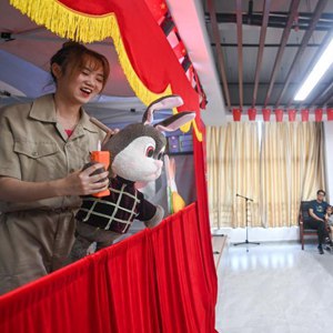 7月20日,在嘉兴市秀洲区新塍镇陡门村文化礼堂,秀湖音乐厅小橙堡儿童艺术剧团在演出儿童剧《红鼻头哥哥和小木偶们》。