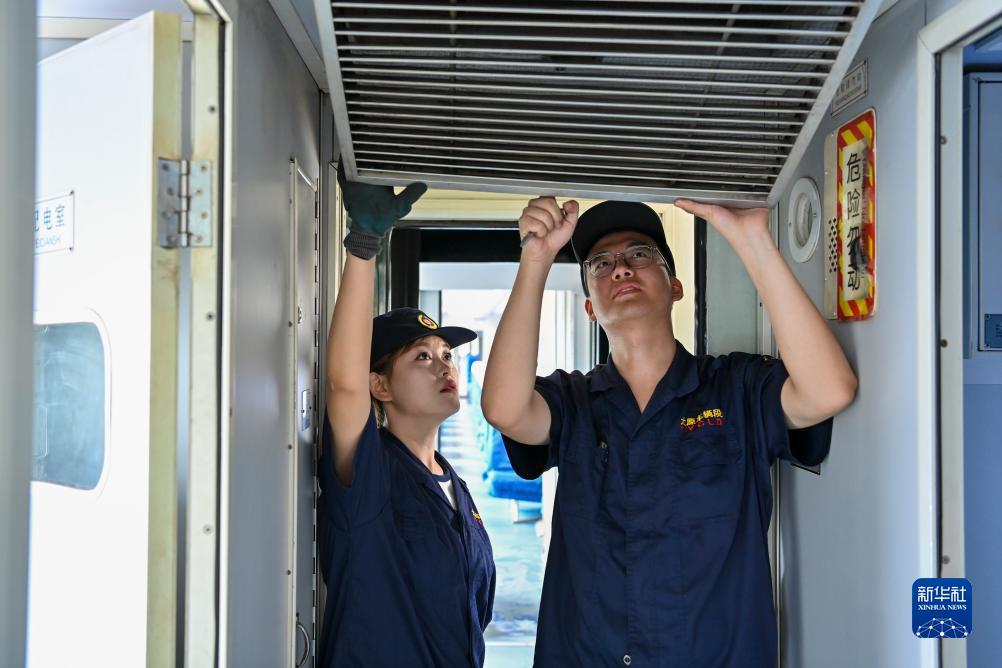 7月20日,刘萍格(左)和同事刘宸睿在一列客车上检查空调回风滤网。