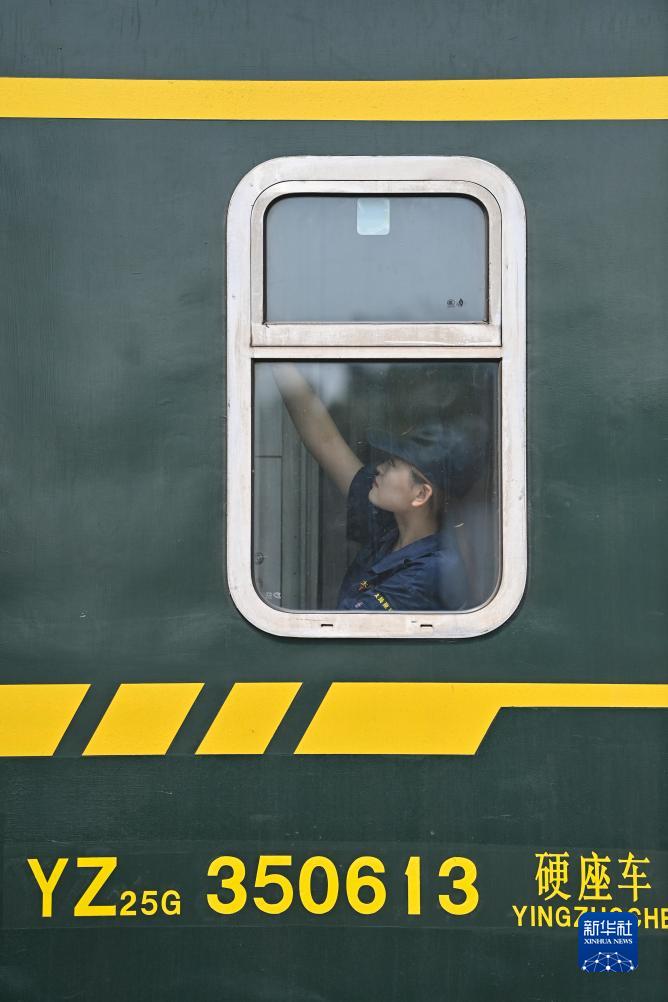 7月20日,刘萍格在一列客车上作业。