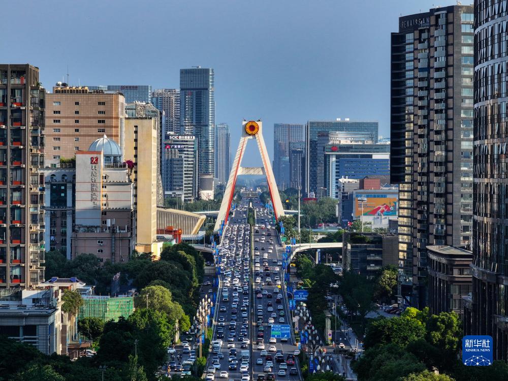 这是6月5日拍摄的位于四川成都人民南路上的人南立交桥,立交桥顶上筑有太阳神鸟金饰图案。