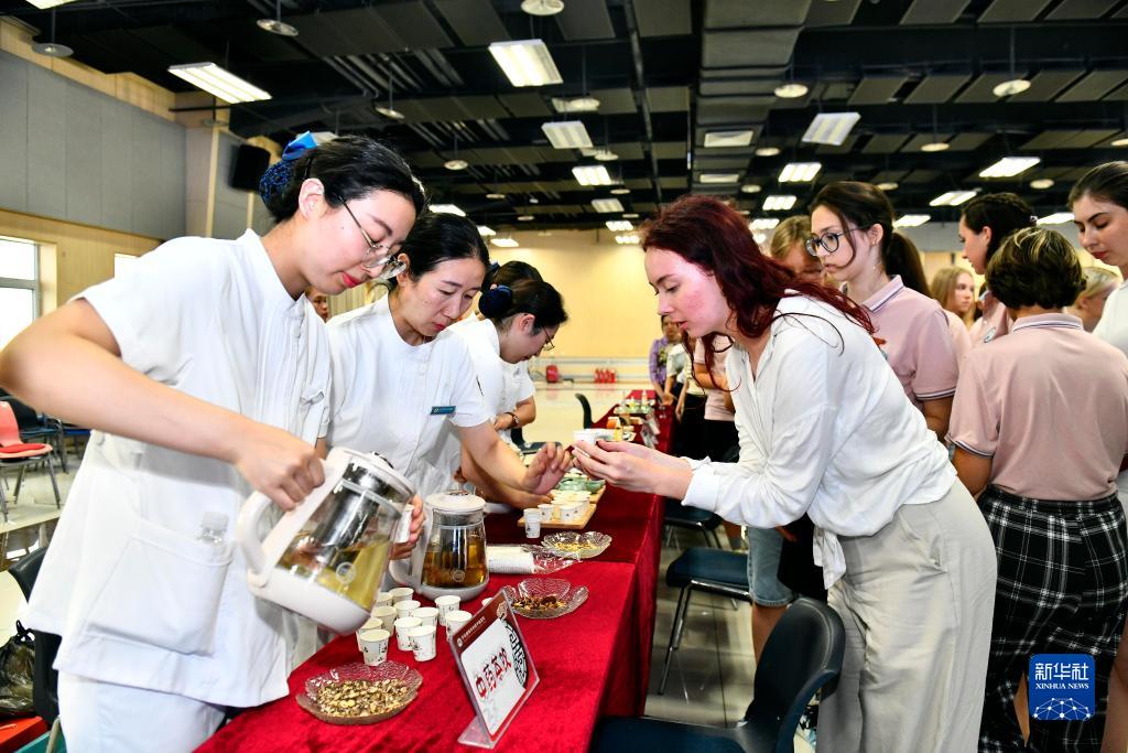 7月20日,在中国石油大学(华东)沉浸式中医药文化体验中心,黄岛区中医医院的医护人员为留学生倒上中药茶饮。