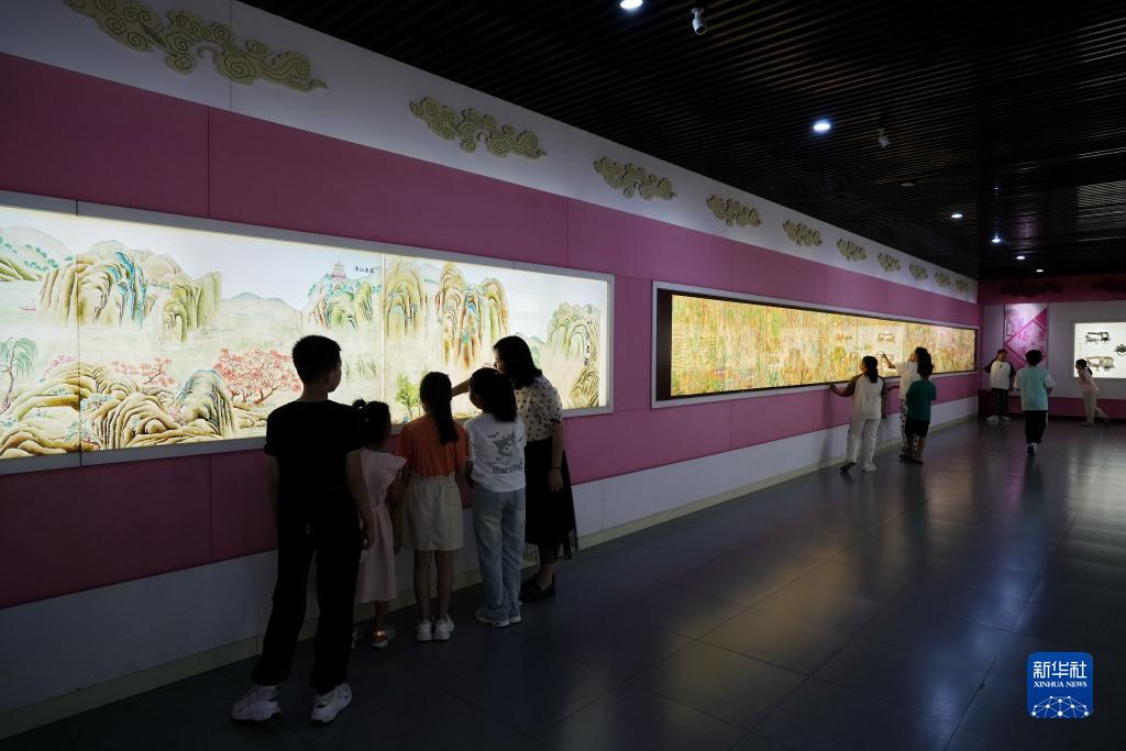 7月21日,孩子们在中国滦州皮影博物馆内参观皮影长卷。
