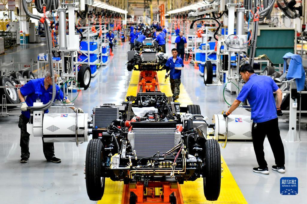 7月21日,在位于威海市文登区的潍柴新能源商用车有限公司,工人在生产线上装配汽车。