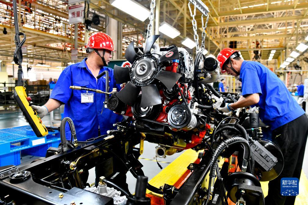 7月21日,在位于威海市文登区的潍柴新能源商用车有限公司,工人在生产线上装配汽车。
