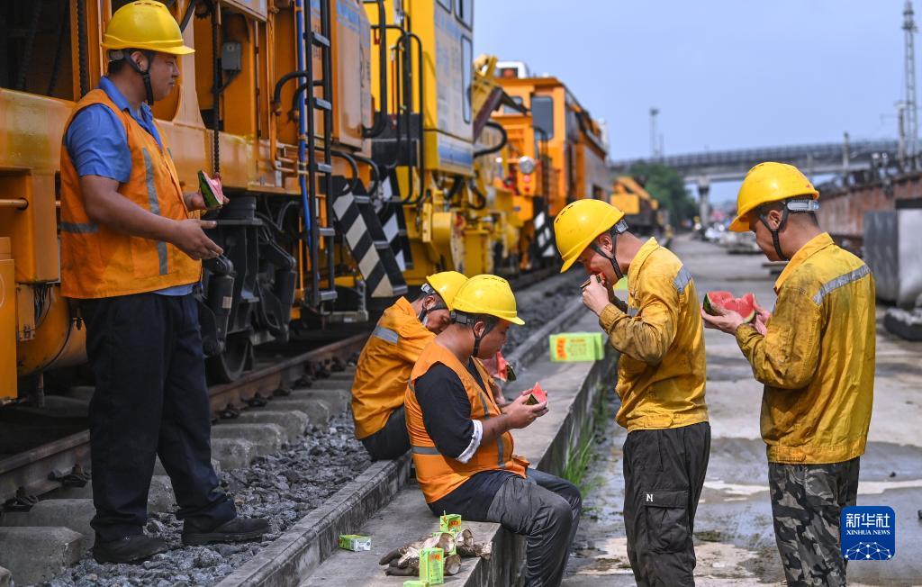 7月21日,国铁南宁局沿海铁路公司钦州工务段工人吃西瓜消暑。