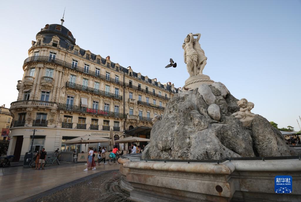 这是法国蒙彼利埃喜剧广场上的喷泉(7月17日摄)。