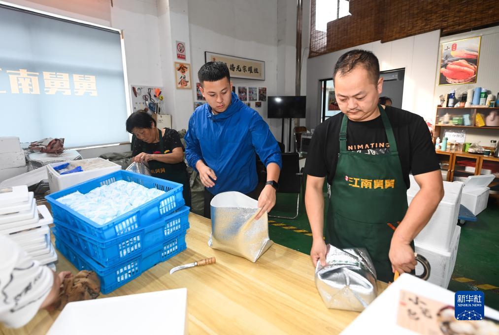 7月21日,在杭州市临安区高虹镇崇阳村,何江南(中)和村民们在仓库里打包,准备发货。何江南回乡后通过短视频创作加带货直播形式,宣传家乡美食美景,实现村级土特产销售和村民收入双提升。